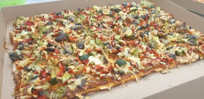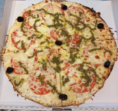 Tomate ou crème fraîche au choix, courgettes fraîches, aubergines fraîches, poivrons, emmental, mozzarella sous un lit de pesto (ail, basilic, huile d'olive, parmesan), olives.