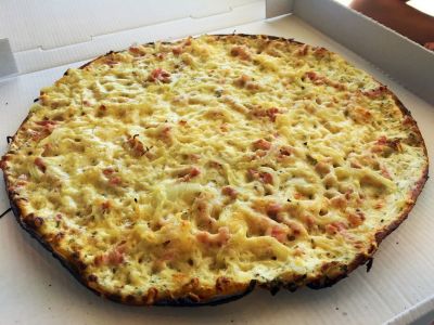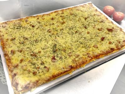 Crème fraîche ou tomate au choix, lamelles de pommes de Terre persillées, lardons, jambon, mozzarella, parmesan, emmental, olives.