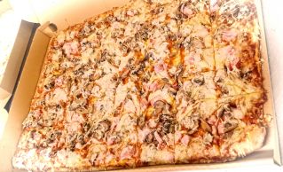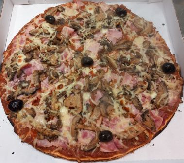 Tomate ou Crème Fraiche, jambon, champignons frais, emmental, mozzarella, olives.
