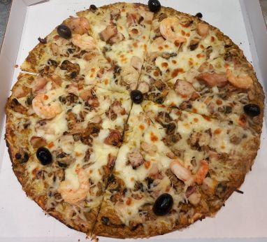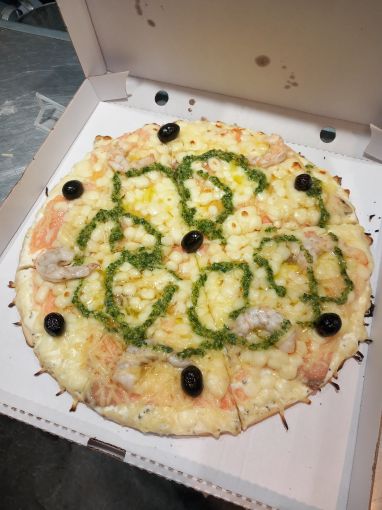 Sauce "rouille maison", fruits de mer frais (poulpe, anneaux et lamelles d'encornets, moules) cuits au court Bouillon au fumé de poisson, queues de gambas, emmental,mozzarella, olives.