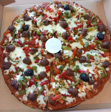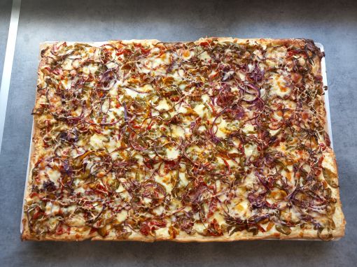 Tomate ou crème fraîche au choix, chorizo, merguez (bœuf/agneau) "cuisinés maison" au piment doux, coriandre cumin et paprika, poivrons frais marinés ail et persil, emmental, mozzarella, olives.
