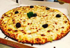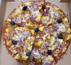 Crème Fraiche ou tomate au choix, dés de poulet cuisinés "aux épices Columbo", oignons rouges frais, emmental, mozzarella, olives.