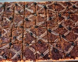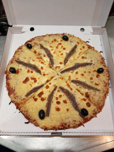 Brandade de morue, filets d'anchois, emmental, mozzarella, olives.