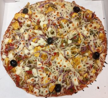 Tomate ou crème fraîche au choix, dés de poulet cuisinés "aux épices Colombo", oignons rouges frais, poivrons ail et persil, emmental, mozzarella, olives.