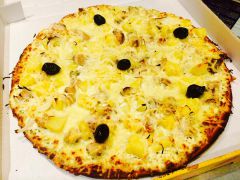 Crème Fraîche ou tomate au choix, dés de poulet cuisinés aux "épices Colombo", emmental, mozzarella, miel, olives.