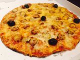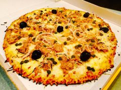 Tomate ou crème fraîche au choix, thon, oignons rouges finement émincés, câpres, emmental, mozzarella, olives.
