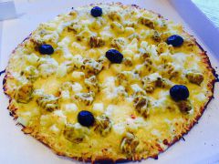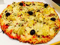 Tomate ou crème fraîche au choix, jambon, champignons frais, cœurs d'artichauts cuisinés, emmental, mozzarella, olives.