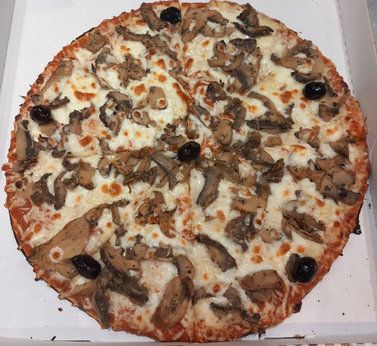 Tomate ou crème fraîche au choix, champignons frais, emmental, mozzarella, olives.