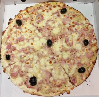 Tomate ou crème fraîche au choix, jambon, emmental, mozzarella, olives.