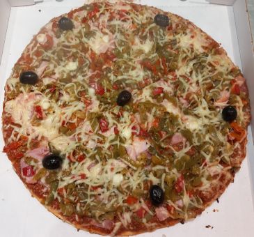 Tomate ou crème fraîche au choix, jambon, poivrons à l'ail et persil, emmental, mozzarella, olives.
