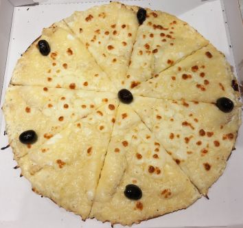 Tomate ou crème fraîche au choix, chorizo, emmental, mozzarella, olives.