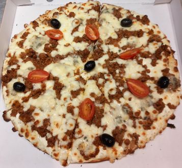 Tomate ou crème fraîche au choix, viande Hachée fraîche cuisinée maison, mozzarella, emmental, parmesan, olives.