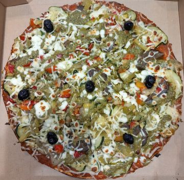 Tomate ou crème fraîche au choix, courgettes fraîches, aubergines fraîches, poivrons, emmental, mozzarella sous un lit de pesto (ail, basilic, huile d'olive, parmesan), olives.