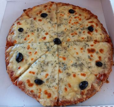 Tomate ou crème fraîche au choix, viande Hachée fraîche cuisinée maison, mozzarella, emmental, parmesan, olives.