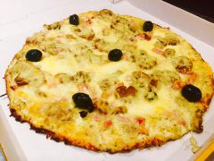 Tomate ou crème fraîche au choix, jambon, champignons frais, cœurs d'artichauts cuisinés, emmental, mozzarella, olives.