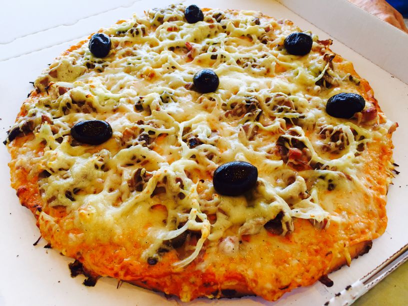 Tomate ou crème fraîche au choix, jambon, emmental, mozzarella, olives.