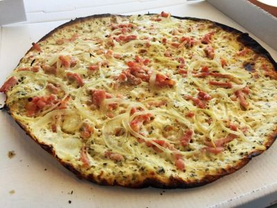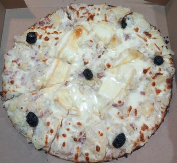 "Tartiflette pmaison" (pommes de terre, lardons, oignons cuisinés au vin blanc), mozzarella, reblochon, olives.