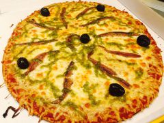 Tomate ou crème fraîche au choix, anchois, pesto (ail, basilic, huile d'olive, parmesan), emmental, mozzarella, olives.